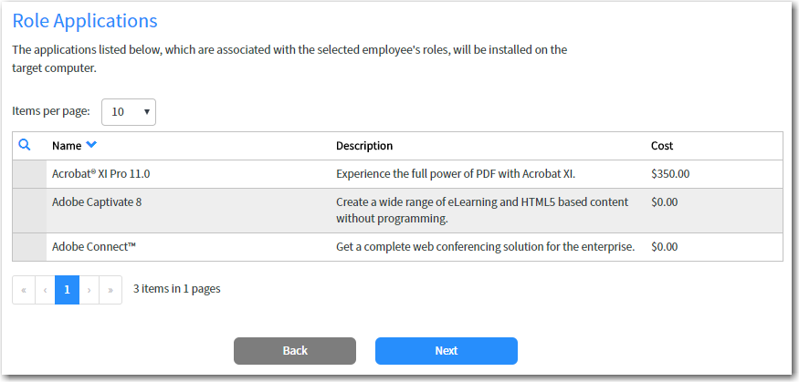 10. Click Next. The Role Applications panel opens, listing the applications that are associated with the selected employee’s roles, which will be installed on the target computer.