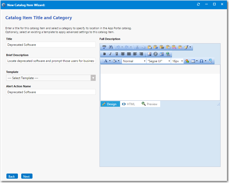 4. Select Alert Action Catalog Item and click Next. The Catalog Item Title and Category panel opens.