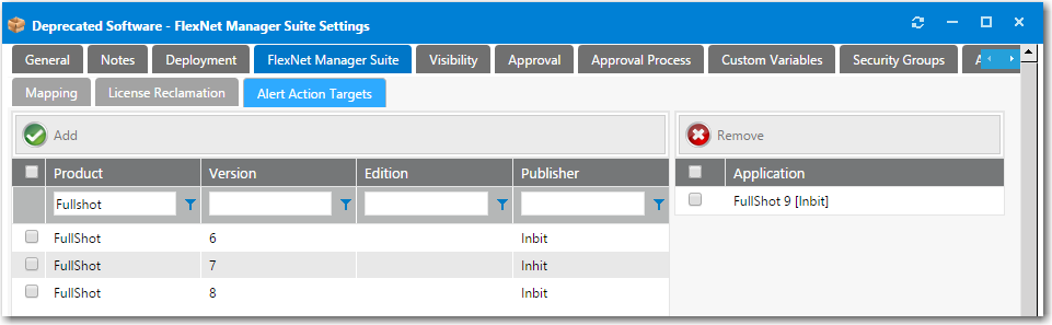 12. If you want to target this alert to owners of a specific application, open the FlexNet Manager Suite > Alert Action Targets tab and perform the following steps: